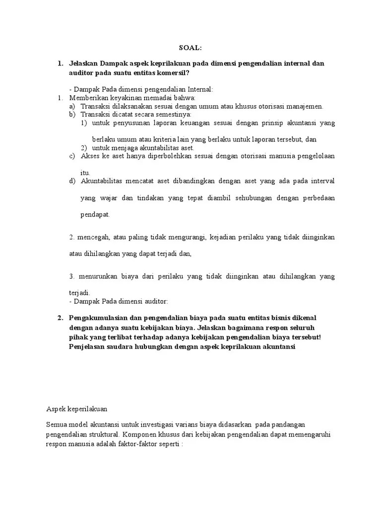 Contoh Kasus Akuntansi Keperilakuan Tentang Audit Internal - Bd Pdf / Sebagai penanggungjawab proses pengendalian internal atas keandalan laporan keuangan suatu organisasi bisnis yang berskala besar biasanya mempunyai controller pusat (corporate controller) dan controller di unit bisnis …